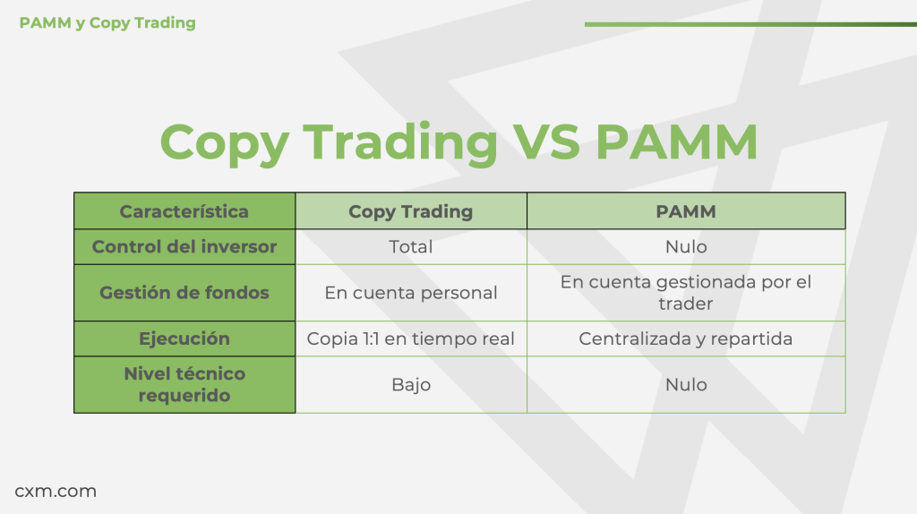 Ambos modelos -PAMM y copy trading- ofrecen una forma de delegar la gestión, pero funcionan de manera distinta y están pensados para tipos de inversor diferentes.