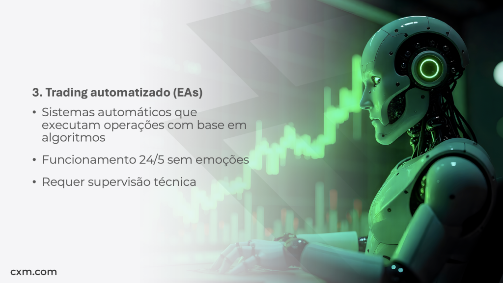 Os Expert Advisors executam estratégias algorítmicas 24/5, sem emoção. Capturam oportunidades intradiárias ou de alta frequência, mas exigem supervisão técnica e testes de robustez antes de operar com dinheiro real.