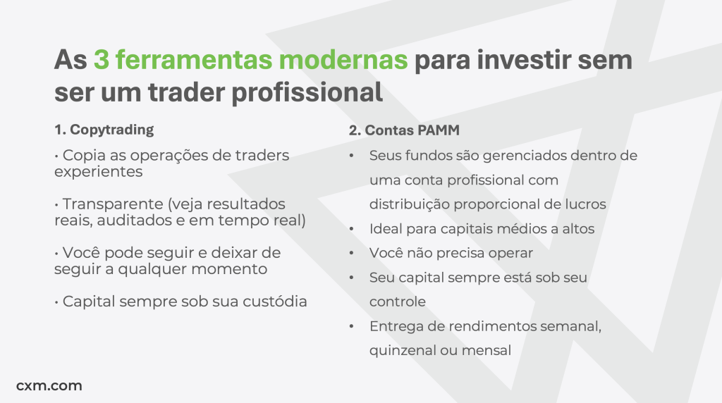 Os recursos são reunidos em uma conta gerenciada por um profissional, que distribui os lucros proporcionalmente. Exige capital médio ou alto, mas libera o investidor da rotina diária e oferece relatórios periódicos de desempenho — perfeito para quem prioriza comodidade sem abrir mão do controle.